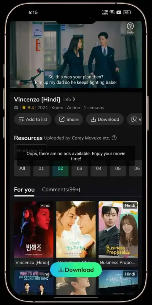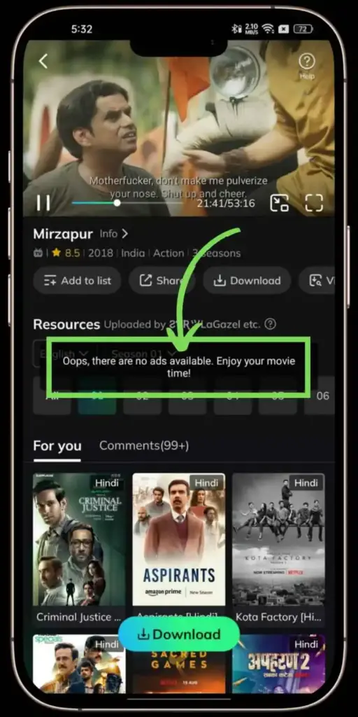 Instead of streaming on a slow internet connection, just download the movie from the app, save it to your device’s gallery, and watch it offline anytime you like.