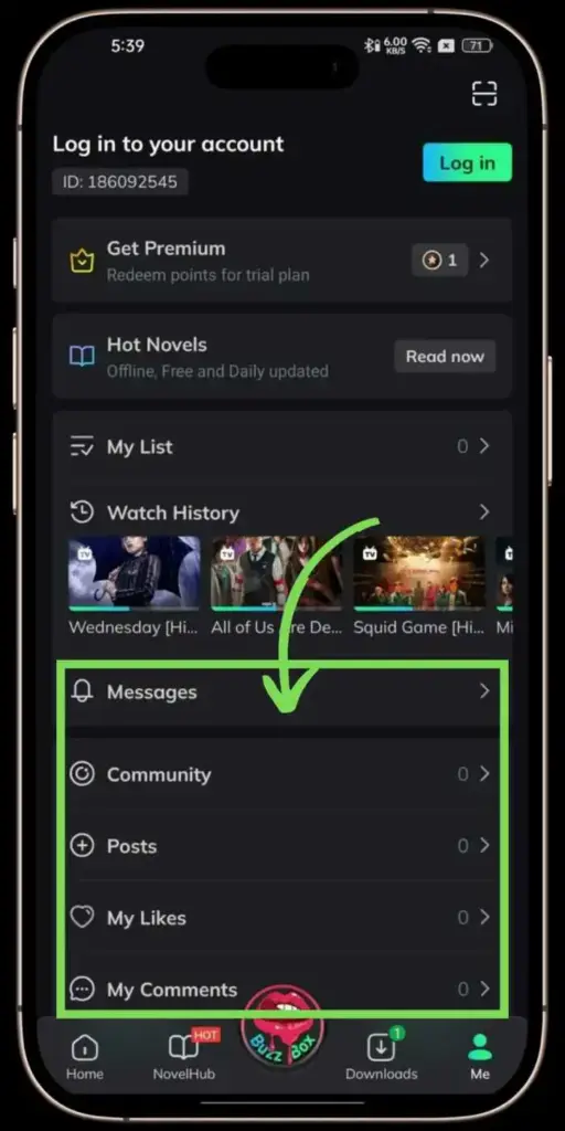 MovieBox features a user-friendly interface designed for easy navigation. At the bottom of the screen, the main menu offers Home for trending recommendations, NovelHub for stories and novels, BuzzBox a hub for short videos, Downloads for offline content, and Me for personal settings and account details.