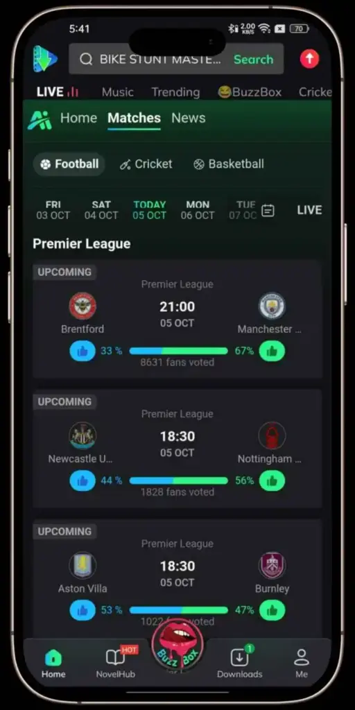 MovieBox provides live TV channels, sports events, and cricket matches, allowing users to enjoy real-time events directly from their mobile devices without additional apps.